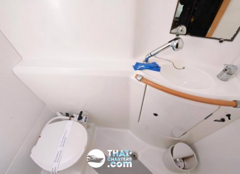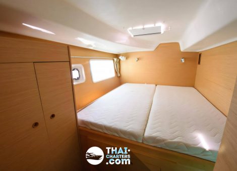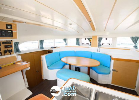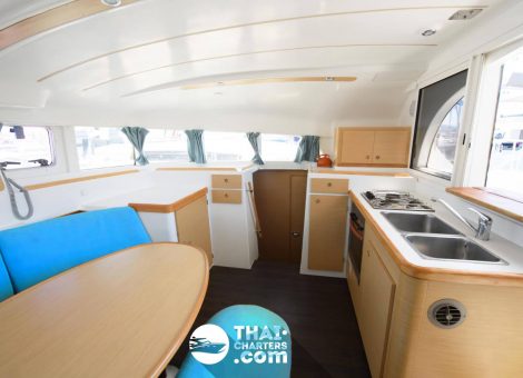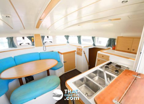 Высота потолков в салоне 2 метра. Комфортное размещение 8 человек, максимальное 15 человек на дневной чартер. Катамаран оснащен 2 дизельными двигателями.